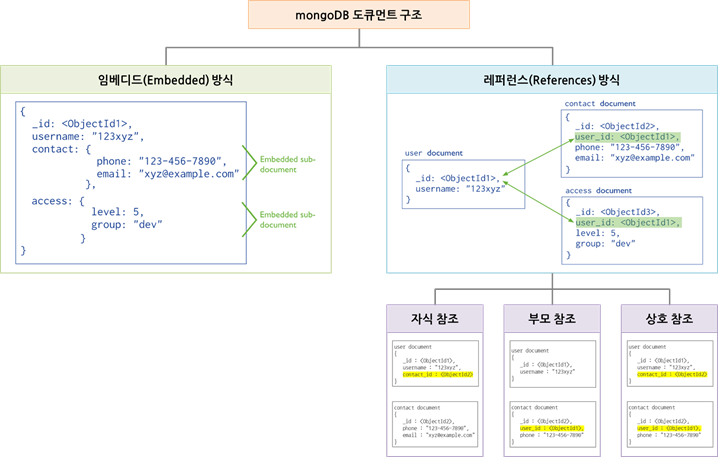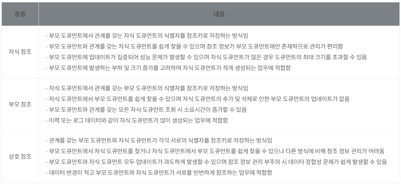 비관계형 데이터베이스에서 데이터를 저장하는 최소 단위를 Document라고 부르며, 이러한 document의 구조를 크게 embedded 방식과 references(세부적으로 자식 참조, 부모 참조, 상호 참조) 방식으로 나눈다.