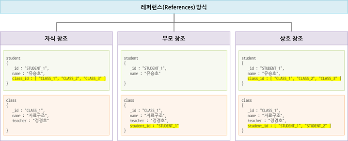 위에서 설명한 기본 참조 방식에서 참조키를 어떤 document에 저장할 것인지에 따라 세부 방식이 나뉨