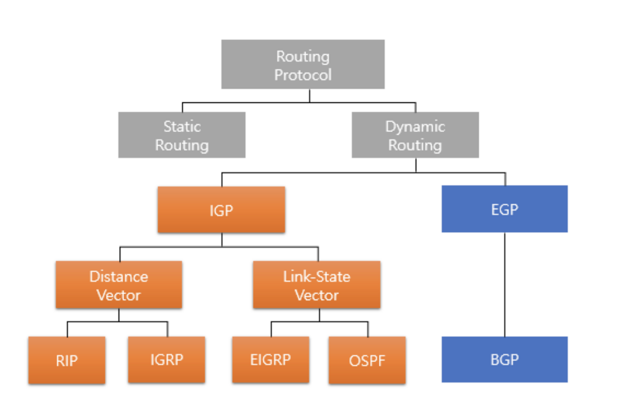 Routing protocol은 router가 패킷을 식별하고 네트워크 경로를 따라 전달하는 방법을 지정하는 규칙 세트이다. Routing protocol은 내부 게이트웨이 프로토콜(Inetrnal Gateway Protocol, IGP)과 외부 게이트웨이 프로토콜(External Gateway Protocol, EGP) 두 가지로 분류된다.
