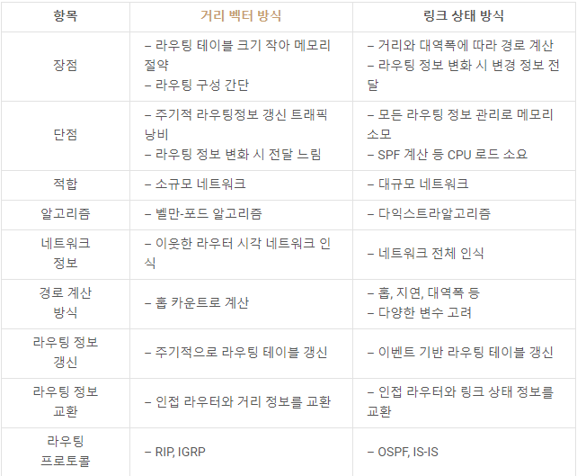 - 예) Open Shortest Path First(OSPF): 다른 모든 라우터에서 정보를 수집하여 데이터 패킷의 대상까지 가장 짧고 빠른 경로를 식별