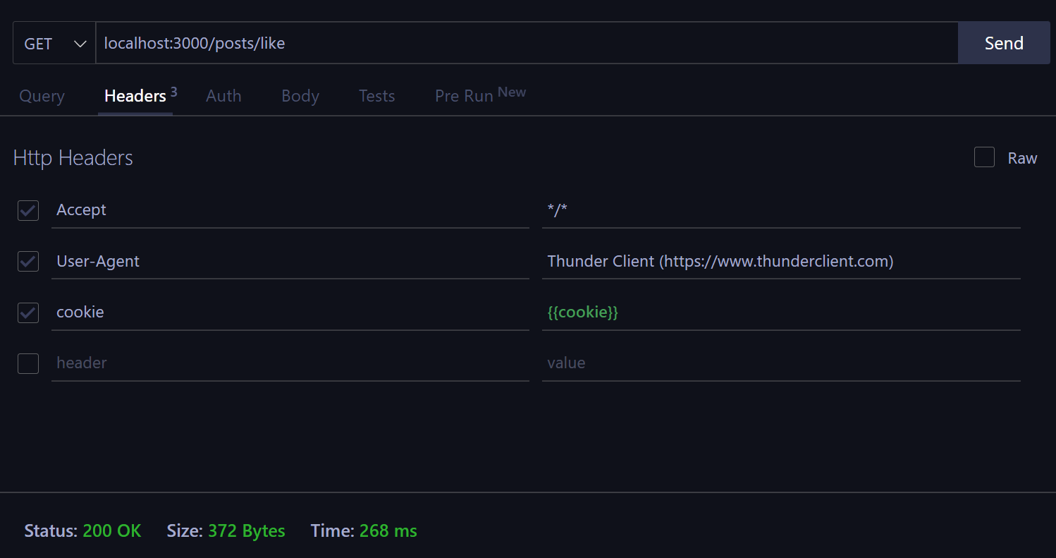 이렇게 설정하면 thunder client에서 heaer에 쿠키로 토큰 값을 담아 보내기 성공!