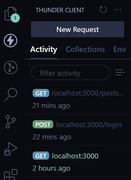 4. 다시, thunder client 메뉴 바에서 Activity 탭을 클릭하고, api 테스트 화면으로 돌아온다.