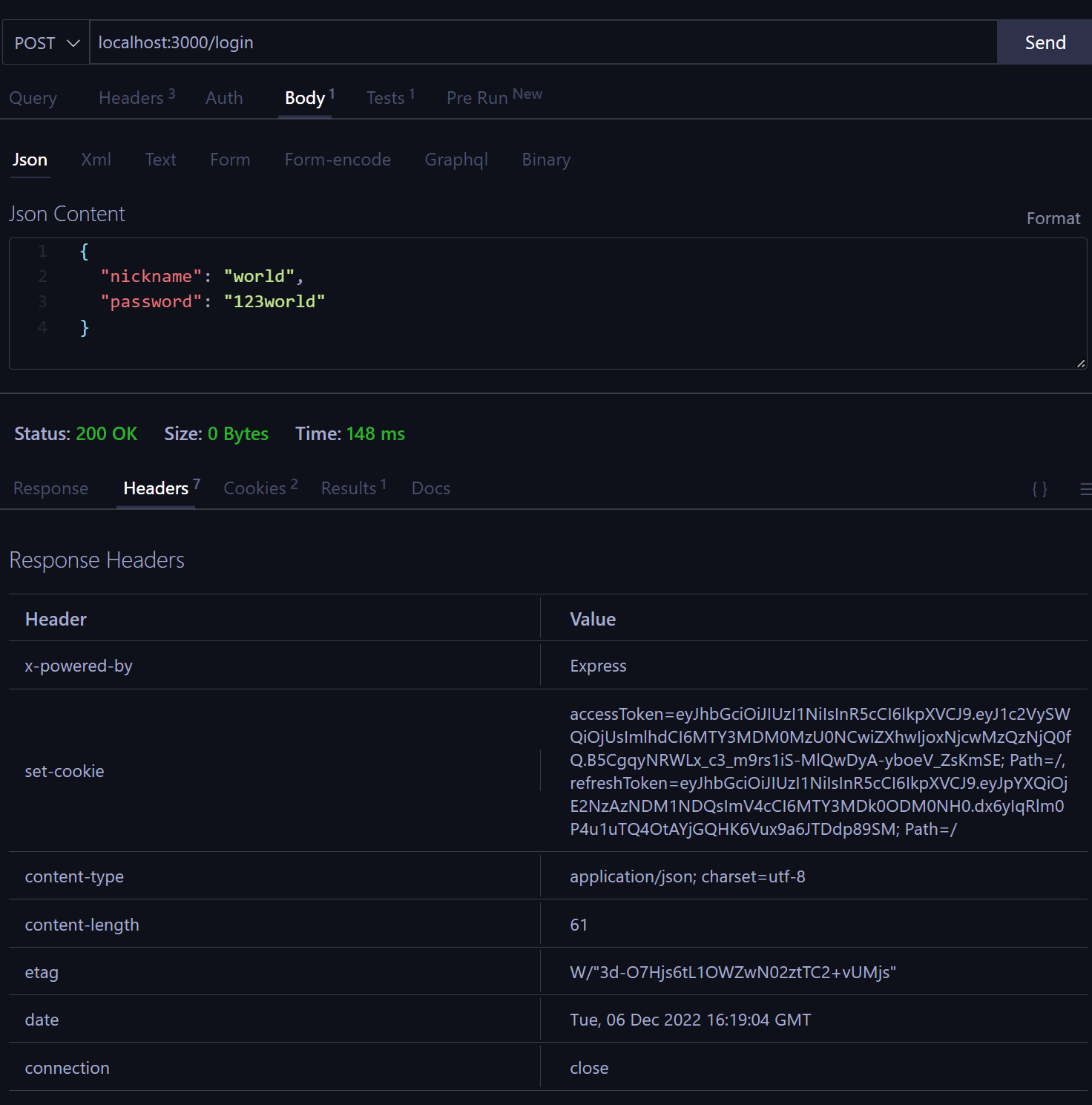 const { accessToken, refreshToken } = req.cookies;	// 요 값을 전달하기 위해 썬드 클라이언트의 여러가지 방법을 찾아보았다.