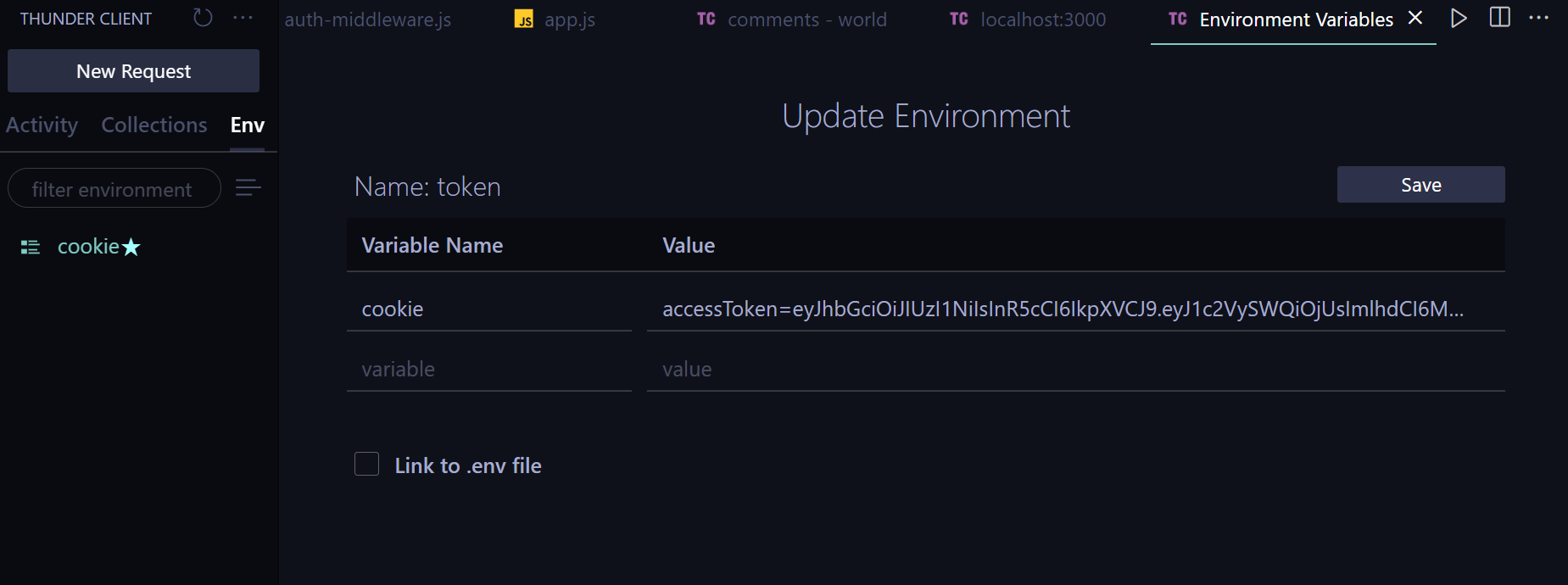 2. thunder client 메뉴 바에서 Env 탭 > cookie를 클릭한다.