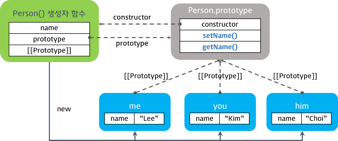 // 생성자 함수(Constructor)로 + new 연산자로 객체 생성 function Person(name) { // 프로퍼티 this.name = name; // 메소드 this.setName = function (name) { this.name = name; }; // 메소드 this.getName = function () { return this.name; }; } const me = new Person("Choi") const you = new Person("Kim") console.log(me, Object.getPrototypeOf(me)) // Person { name: 'Choi',setName: [Function (anonymous)], getName: [Function (anonymous)]} {} console.log(you, Object.getPrototypeOf(you)) // Person { name: 'Kim', setName: [Function (anonymous)], getName: [Function (anonymous)]} {} // 메소드를 Person 생성자 함수의 prototype에 추가 function Person(name) { // 프로퍼티 this.name = name; } function setName(name) { this.name = name } function getName(name) { return this.name; } Person.prototype.setName = setName Person.prototype.getName = getName const me = new Person("Choi") const you = new Person("Kim") console.log(me, Object.getPrototypeOf(me)) // Person { name: 'Choi' } { setName: [Function: setName], getName: [Function: getName] } console.log(you, Object.getPrototypeOf(you)) // Person { name: 'Kim' } { setName: [Function: setName], getName: [Function: getName] }