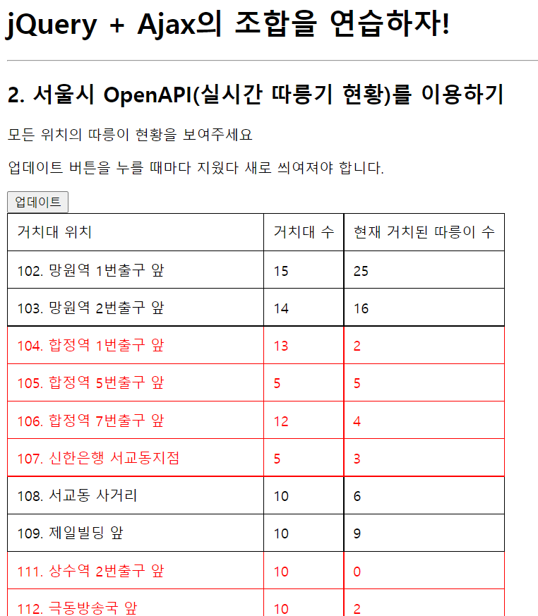 두번째, 업데이트 버튼을 누르면 서울시 따릉이의 대수 현황을 보여준다.