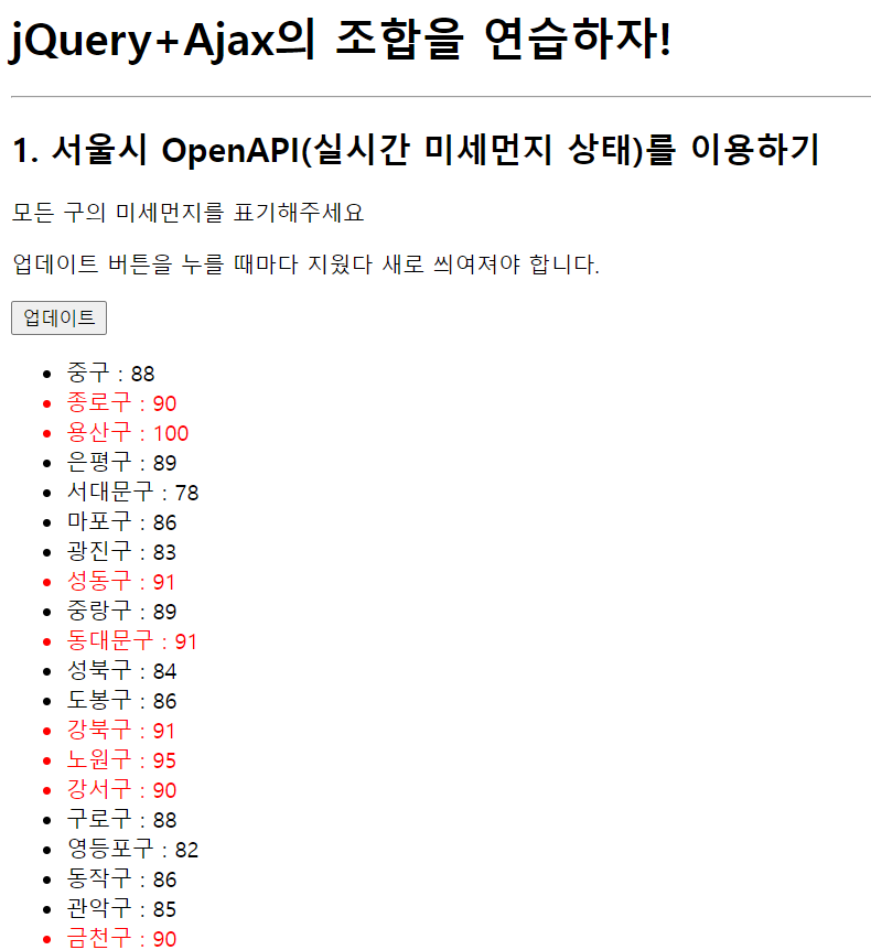 첫번째, 업데이트 버튼을 누르면 실시간 서울의 구단위 미세먼지 상태를 볼 수 있다.