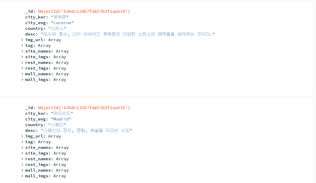 우리는 네이버 여행 사이트에서 스크래핑을 통해 아래와 같이, 각 여행지별로 관광지/식당/쇼핑몰 등의 목록과 이미지를 array로 저장하여 db를 구축했다.
