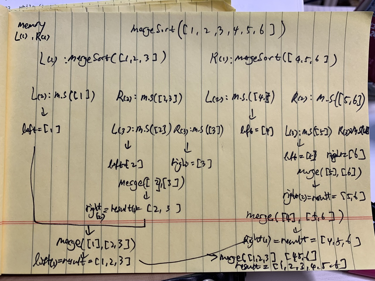 컴퓨터는 메모리에 순서를 메겨 left와 right를 저장하고 (left(1), left(2)와 같은 식으로..) 역순으로 merge를 하는 것이다.