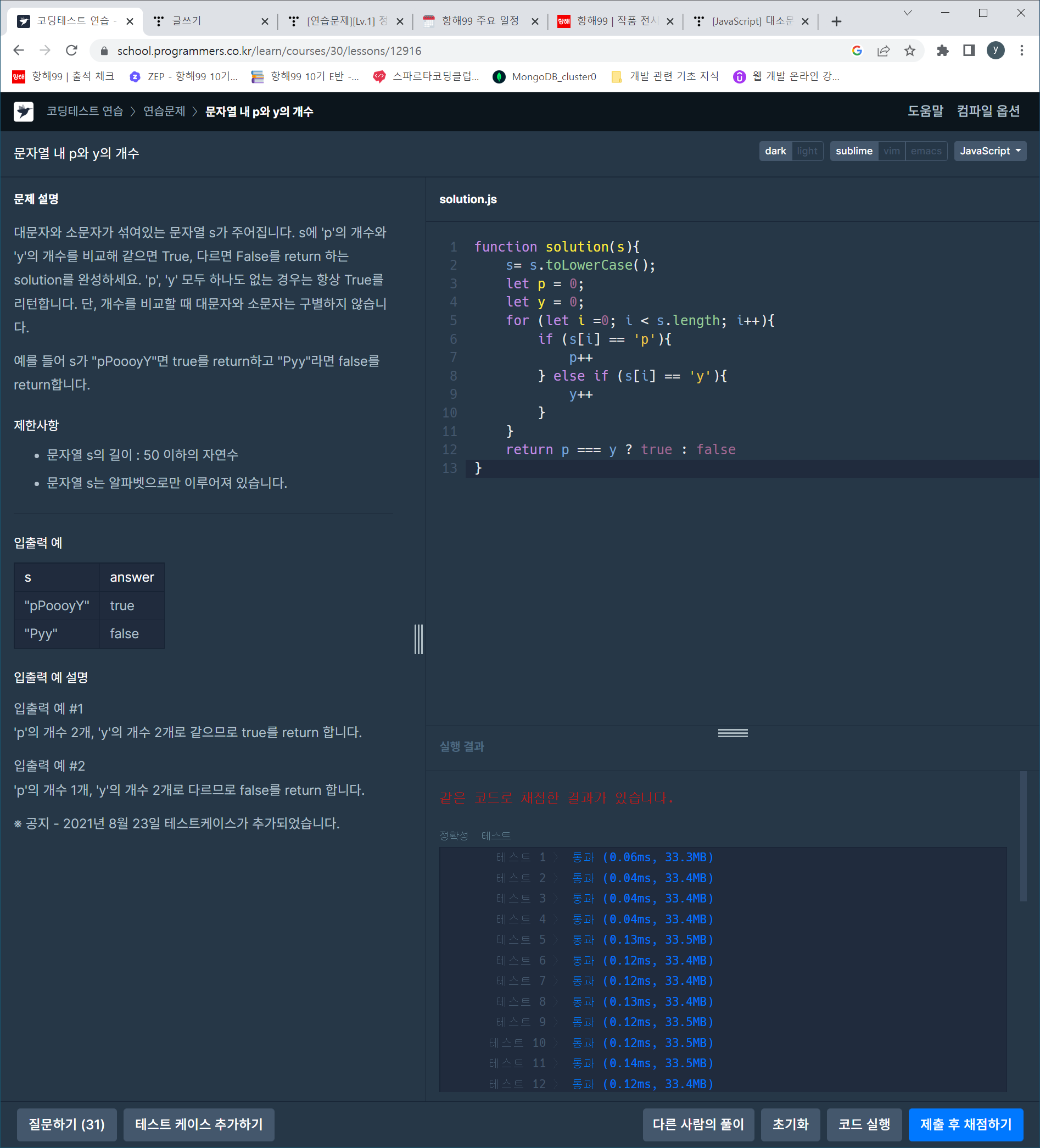 이후 문자열을 돌면서 p와 y 개수를 저장하고, 마지막에 ternary operator를 사용하여 true / false를 리턴하도로고 했다.