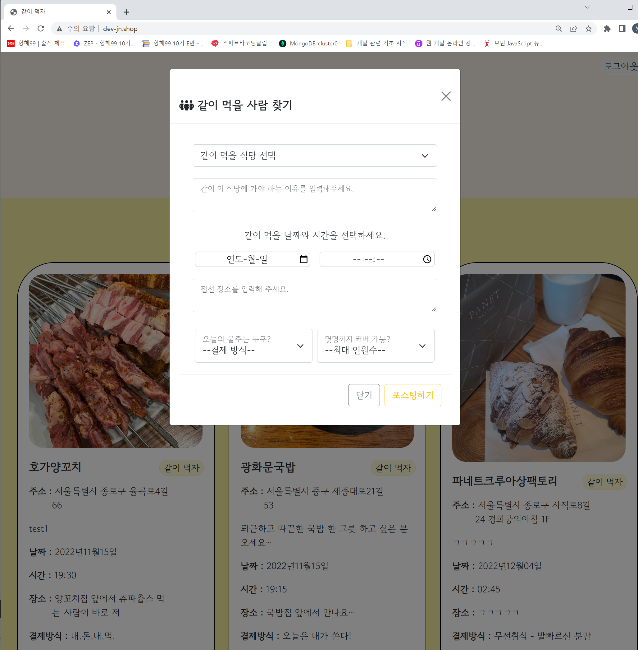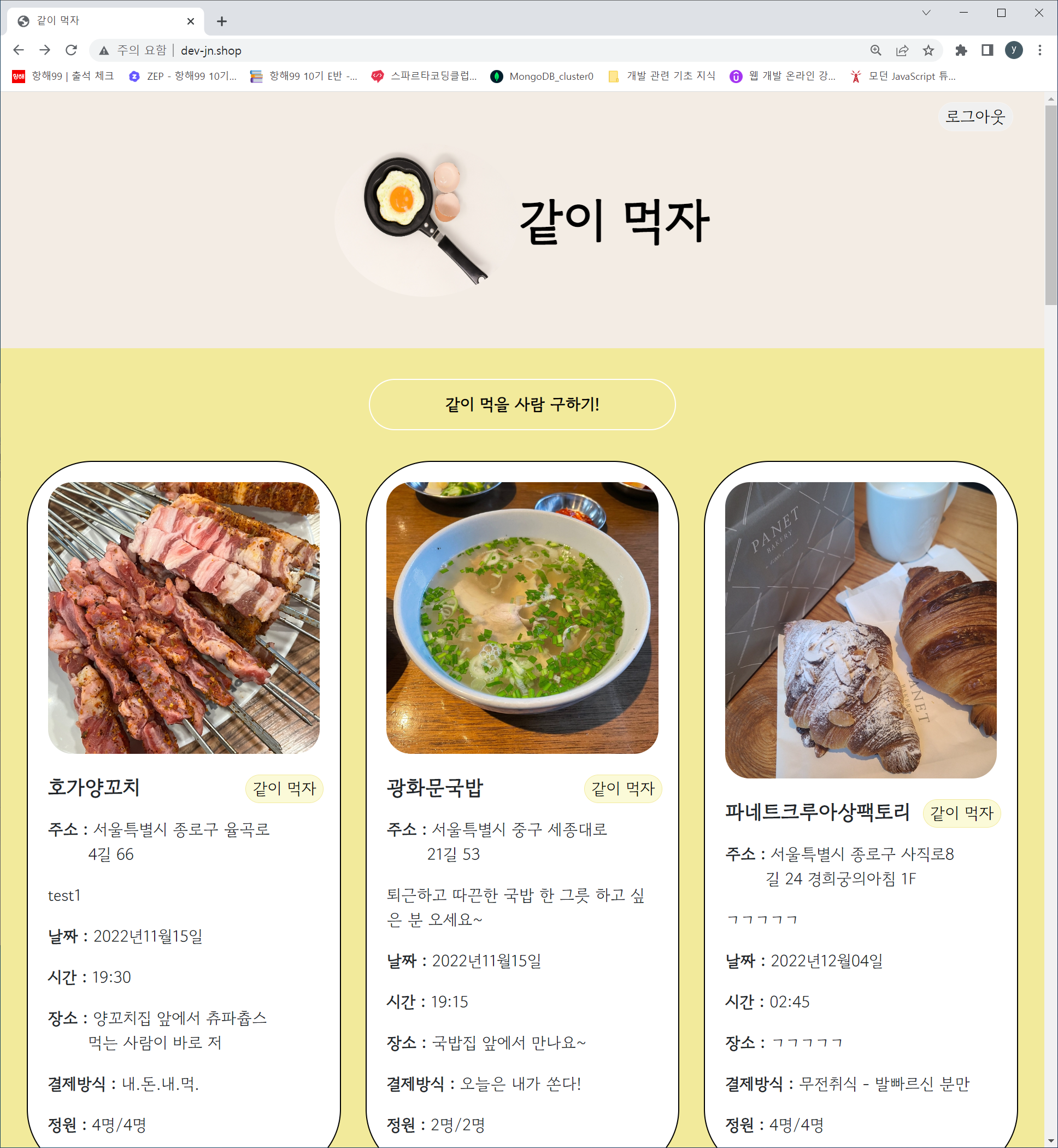 내가 구현한 페이지는 아래의 메인 페이지인데, 포스팅 카드드 정보를 메인 페이지에 뿌려주고, 사용자의 아이디가 저장된 토큰값을 받아와 로그인 확인 처리를 해주고, "같이 먹을 사람 구하기" 버튼을 클릭하면, 정보를 입력할 수 있는 모달창을 띄워주고, 입력값을 다시 서버에서 db로 쌓아주고, "같이 먹자" 버튼을 클릭하면 같이 먹을 유저 아이디가 저장된 db와 대조하여 유효성 검사를 한 후 참여자를 추가하는 일련의 과정을 구현했다. (+로그아웃 버튼ㅋㅋ)