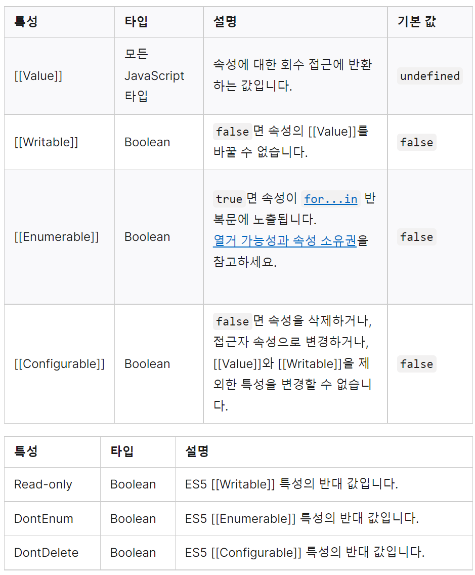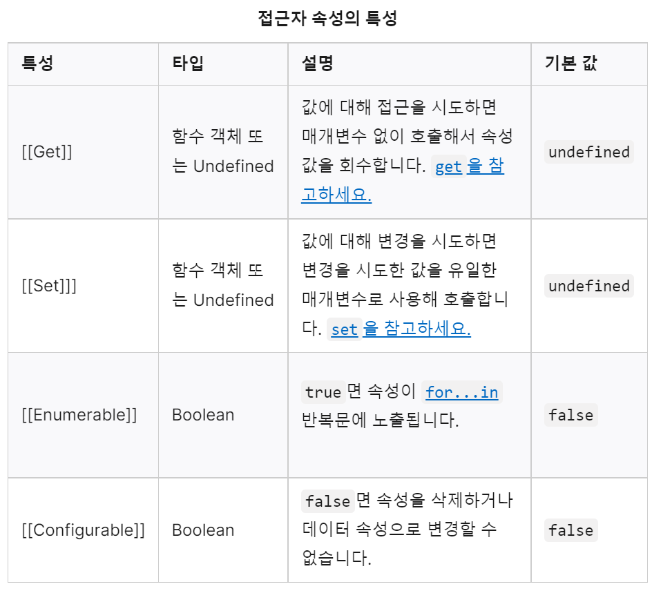 • 접근자 속성 : 접근자 속성은 키를 두 개의 접근자 함수(get, set) 중 하나 이상과 연결하여 값을 가져오거나 저장